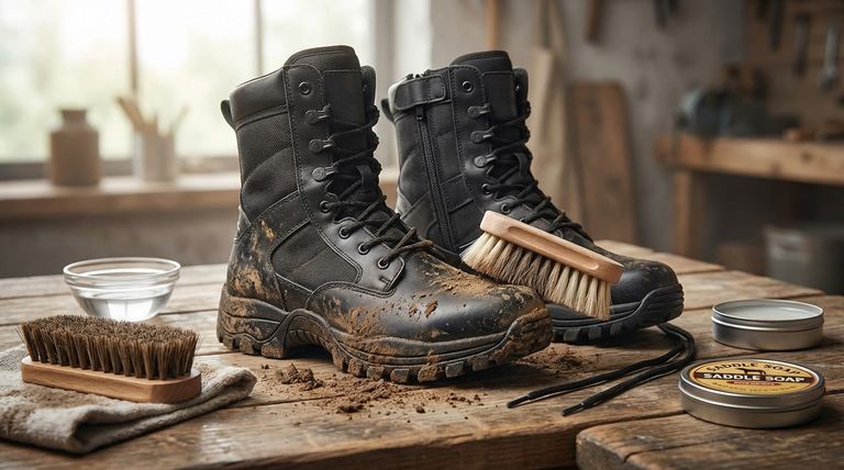 لإزالة الأوساخ الزائدة من الأحذية العسكرية، أداتك الأساسية هي فرشاة ذات شعيرات ناعمة. يتيح لك ذلك إزالة الطين والغبار المتراكم بفعالية من جميع الأسطح، مع إيلاء اهتمام خاص للأخاديد في النعل والدرزات حيث تلتقي المواد المختلفة. هذه الفرشاة الجافة الأولية هي الخطوة الأولى الأكثر أهمية.